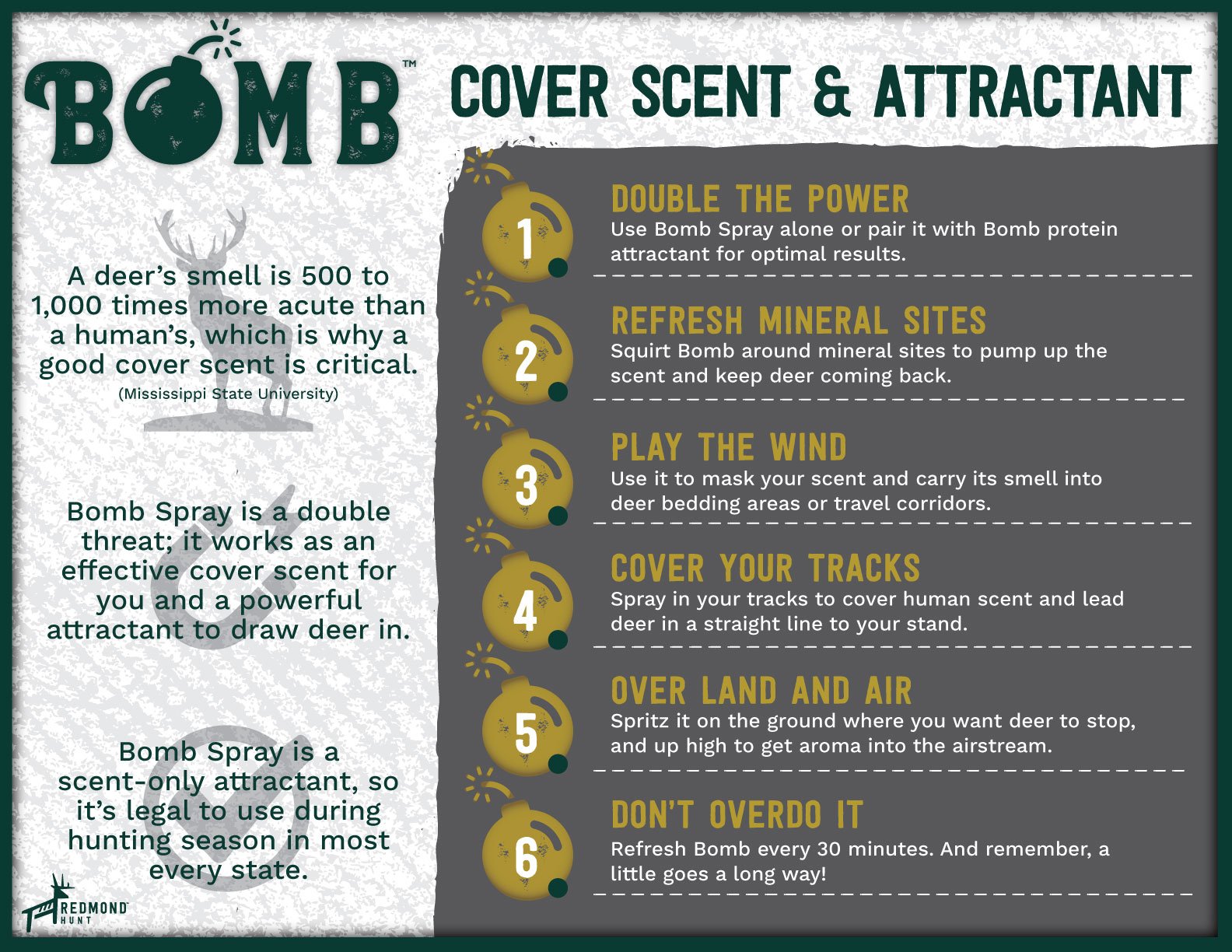 Redmond Bomb Spray scent & attractant helps you overcome a deer's keen sense of smell with an amazing cover scent that also draws deer in.